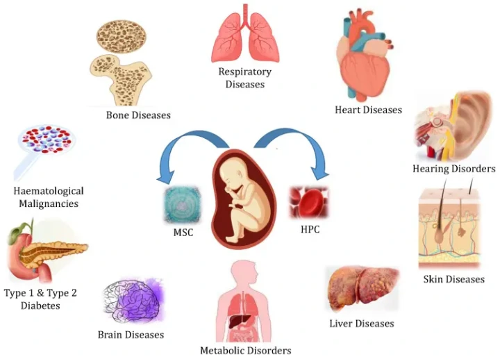 Y học tái tạo ứng dụng tế bào gốc đa tiềm năng trong điều trị lâm sàng. Máu cuống rốn (UCB) tươi chứa các tế bào gốc không thuộc hệ tạo máu, tế bào nội mô, MSCs, và số lượng không giới hạn của các tế bào soma. Hiện tại, tế bào gốc từ UCB được sử dụng rộng rãi để điều trị các bệnh về tim mạch, gan, mắt, xương khớp, thần kinh và nội tiết.