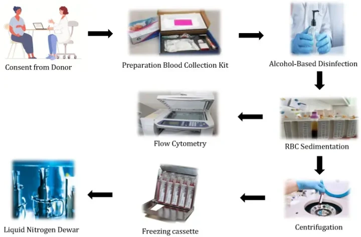 Sau khi thu thập, UCB được giữ nhiệt độ ổn định và các túi máu được khử trùng bề mặt trước khi vào phòng thí nghiệm chính. Sau khi tách hồng cầu, mẫu máu được bảo quản đông lạnh với các tế bào đơn nhân. Chất lượng của máu đông lạnh được đánh giá dựa trên tổng số tế bào hạt nhân, và sự hiện diện của tế bào CD34+ và CD45+.